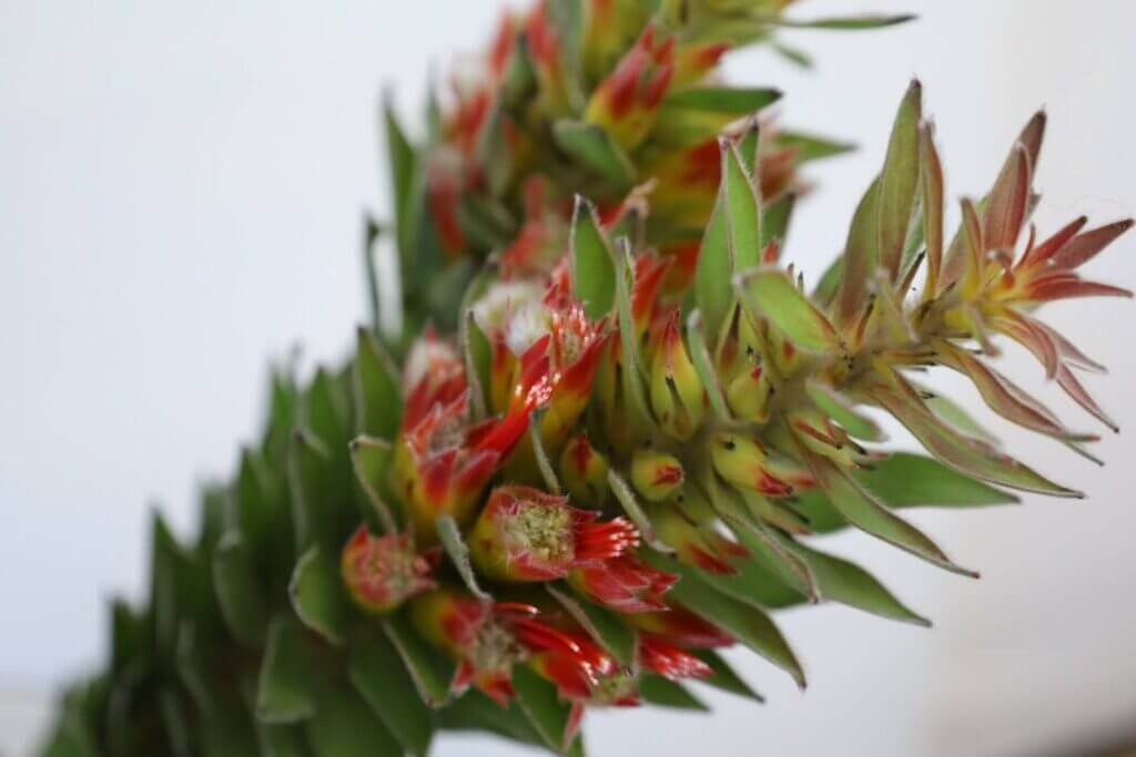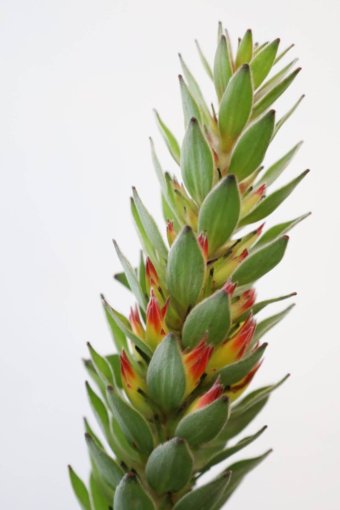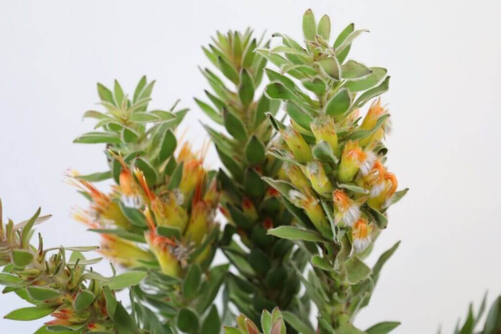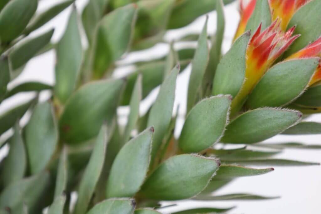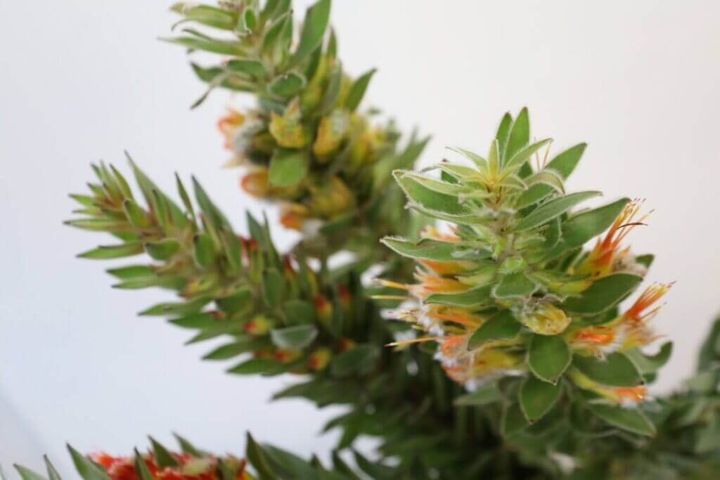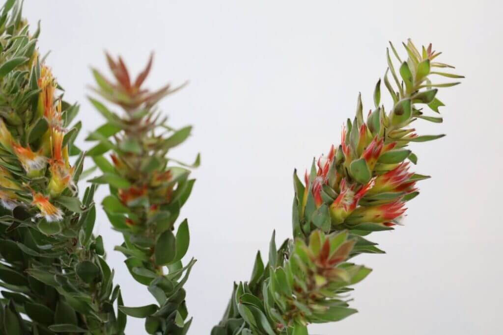 特徴:ミメテス・ヒルタスは、南アフリカ原産のワイルドフラワーで、細く尖った葉が密につき、先端に赤〜オレンジの羽毛のような苞(ほう)をつける個性的な花材です。植物全体にやや毛があり、光沢のない質感と、ナチュラルで野趣あふれるシルエットが魅力。草丈は40〜60cm前後。観賞用としては稀少で、流通量は限られます。