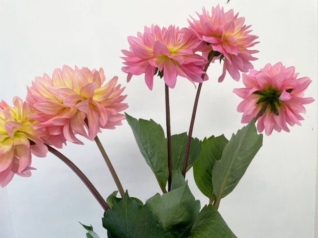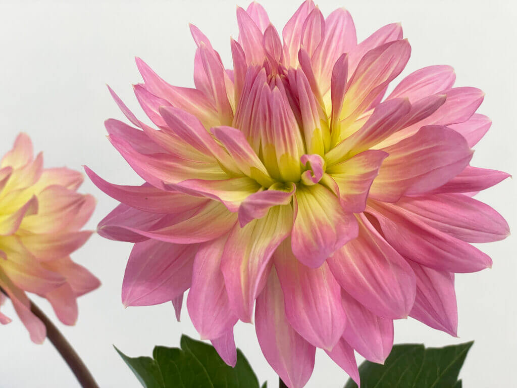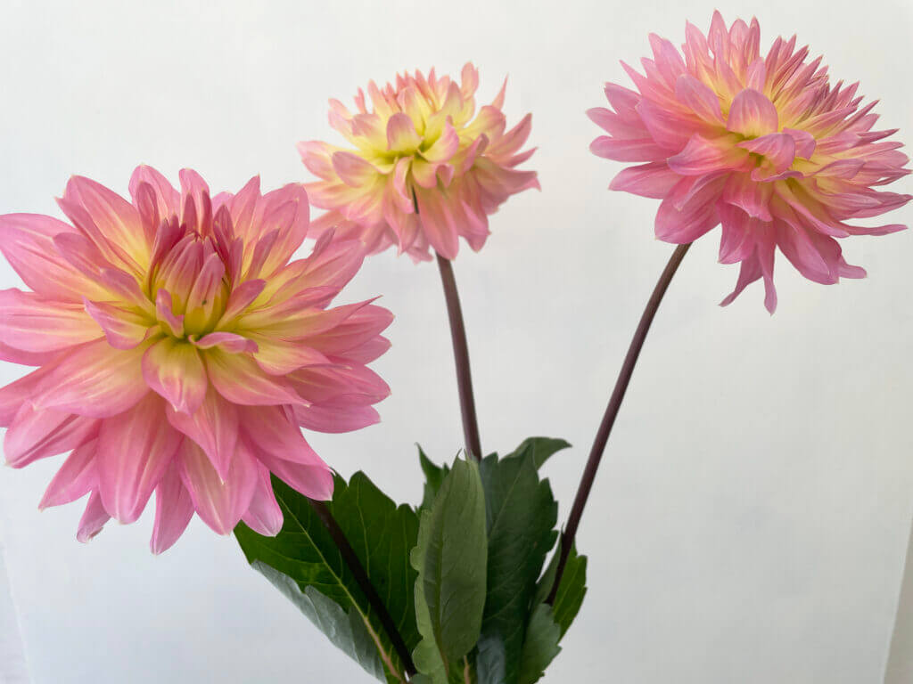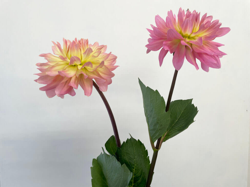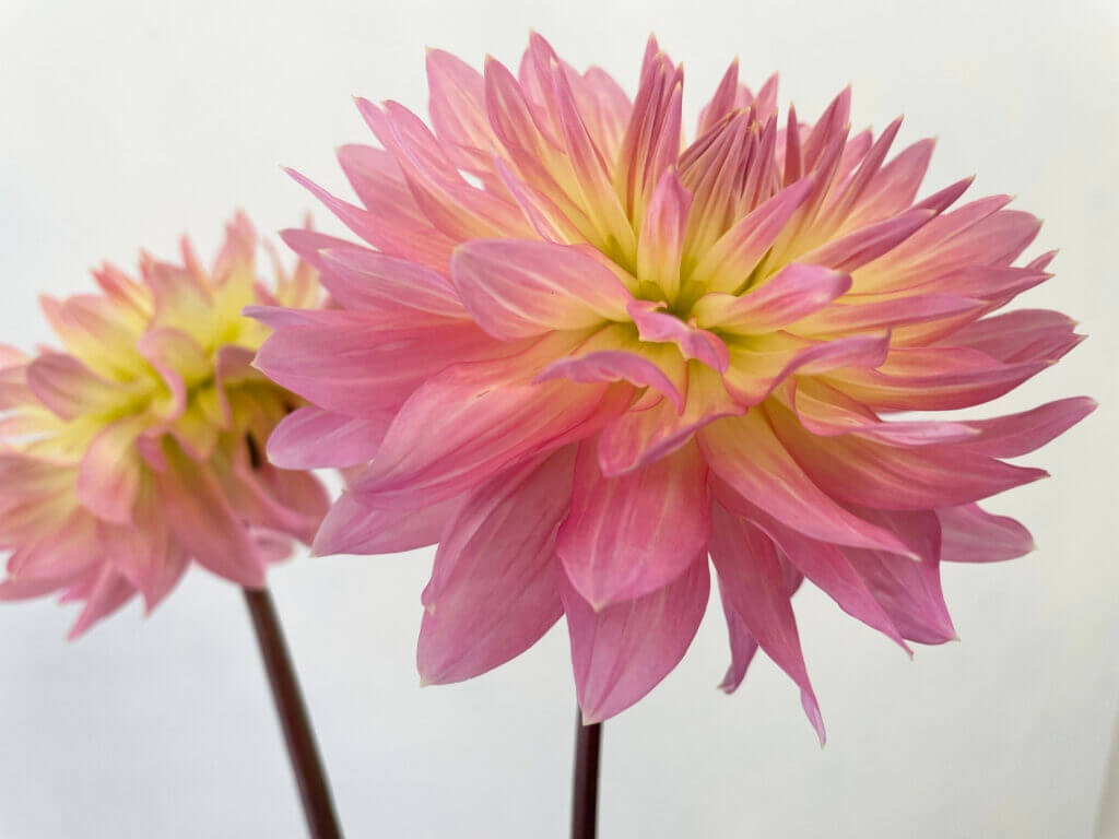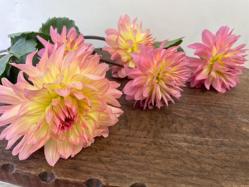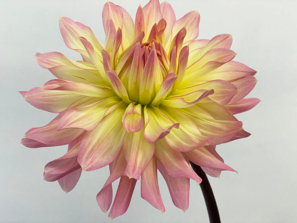 特徴:『ムーンワルツ』は、花弁の内側が淡い黄色、外側に向かって淡いピンク色へとグラデーションする中輪サイズ(花径約17cm)のダリアです。咲き方はスイレン咲きで、花弁が平らに広がり、やわらかな印象を与えます。草丈は80〜100cm程度で、切り花や庭植えとしても扱いやすい品種です。