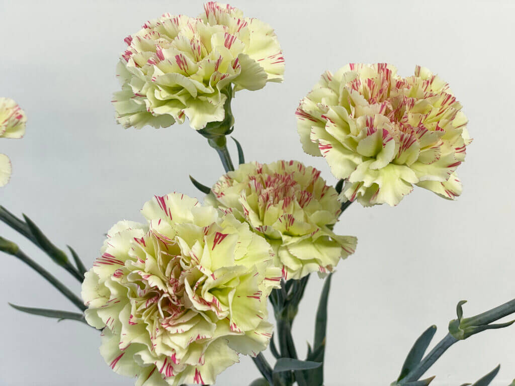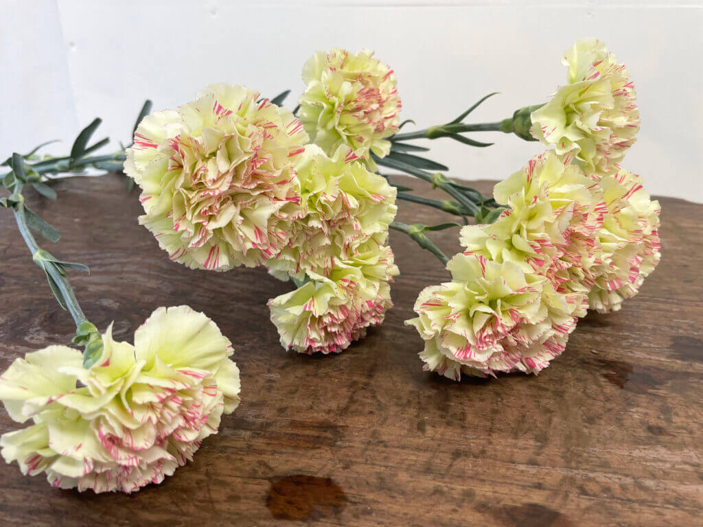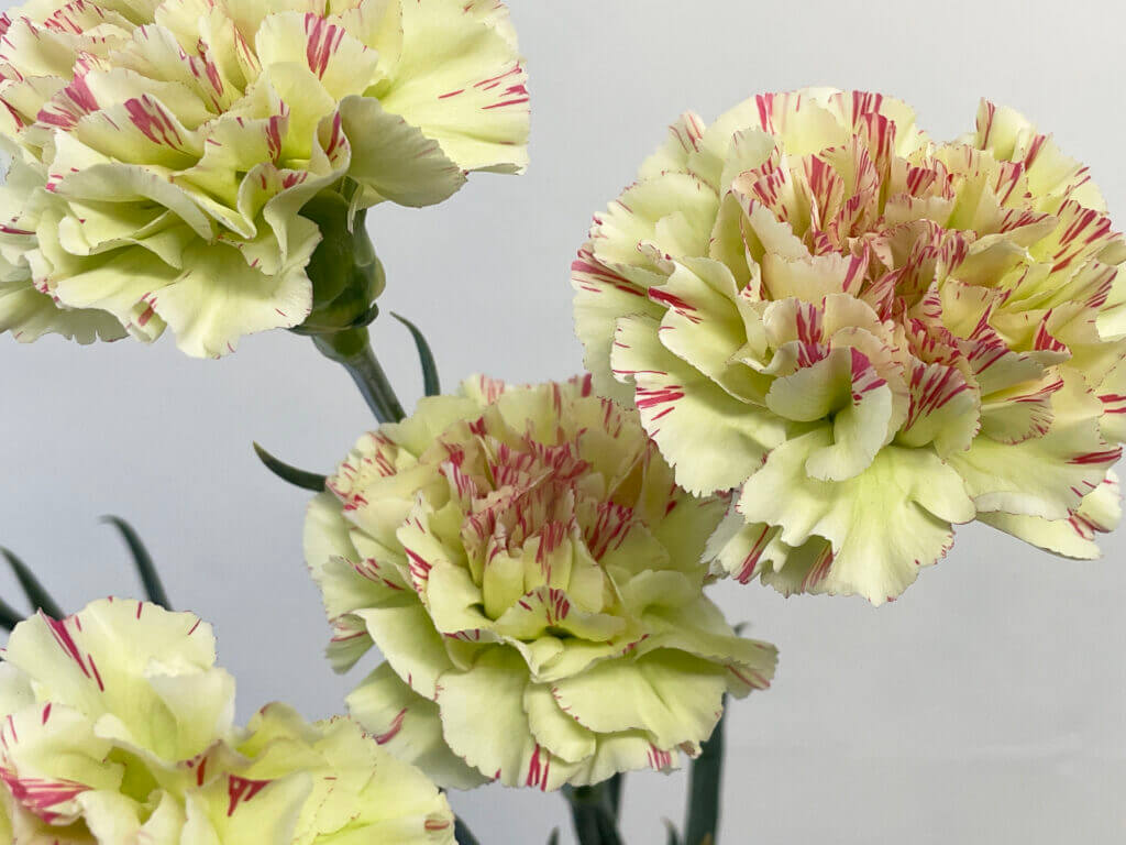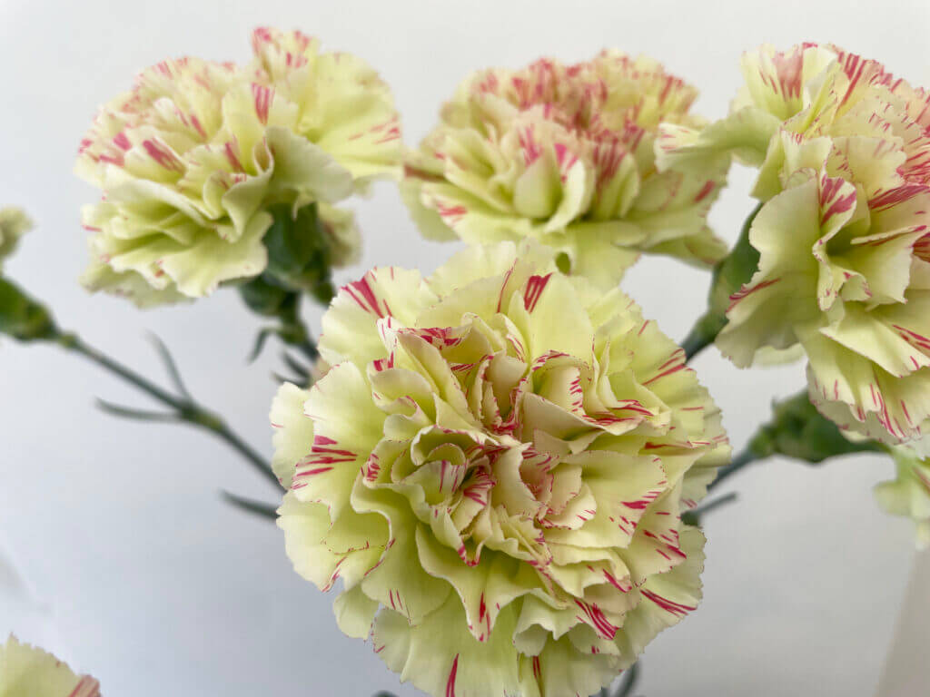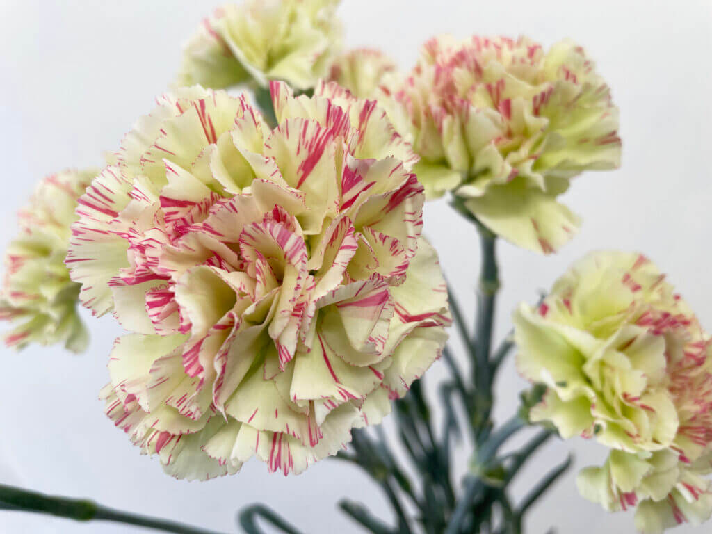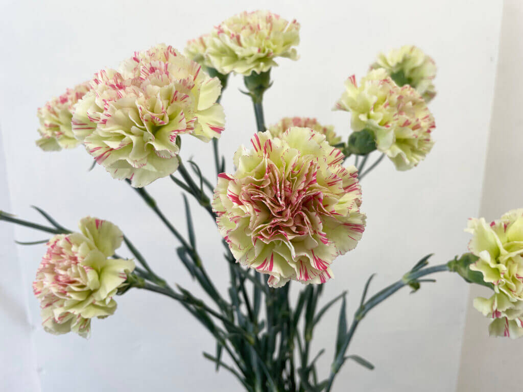 特徴:『モチ』は、淡いクリームホワイトを基調に、花弁に赤紫〜ピンク系の細かなストライプ模様が入る印象的なスプレーカーネーションです。花径は約4〜5cmで、繊細なフリル咲きの小ぶりな花が複数輪つきます。個体差により模様の入り方に違いがあるのも魅力で、柔らかくもアーティスティックな印象を与える一輪です。草丈は約50〜60cm前後。