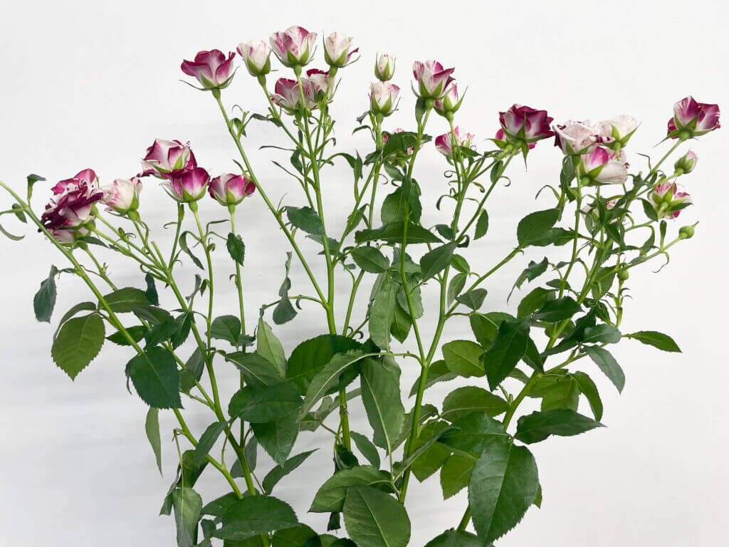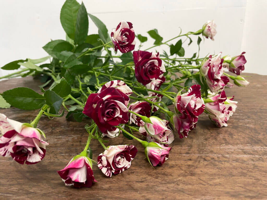 特徴:『スパークリンググラフィティ』は、淡いピンク〜ベージュのベースに赤や濃ピンクの絞り模様が入る、ユニークで印象的なスプレーバラ。1本の茎に3〜5輪程度の小中輪の花が付き、花径は約3〜4cm。咲き方はロゼット〜カップ咲きで、グラフィティ(落書き)のような絞り模様がまさに「スパークリング」な華やかさを演出します。草丈は40〜60cm前後。