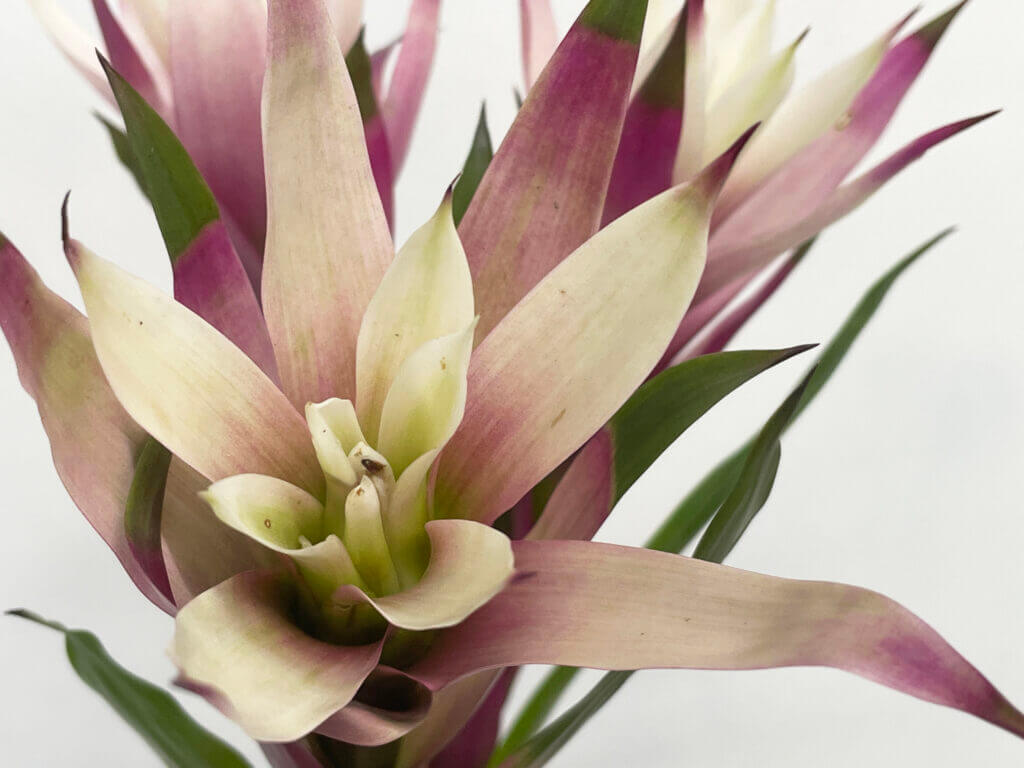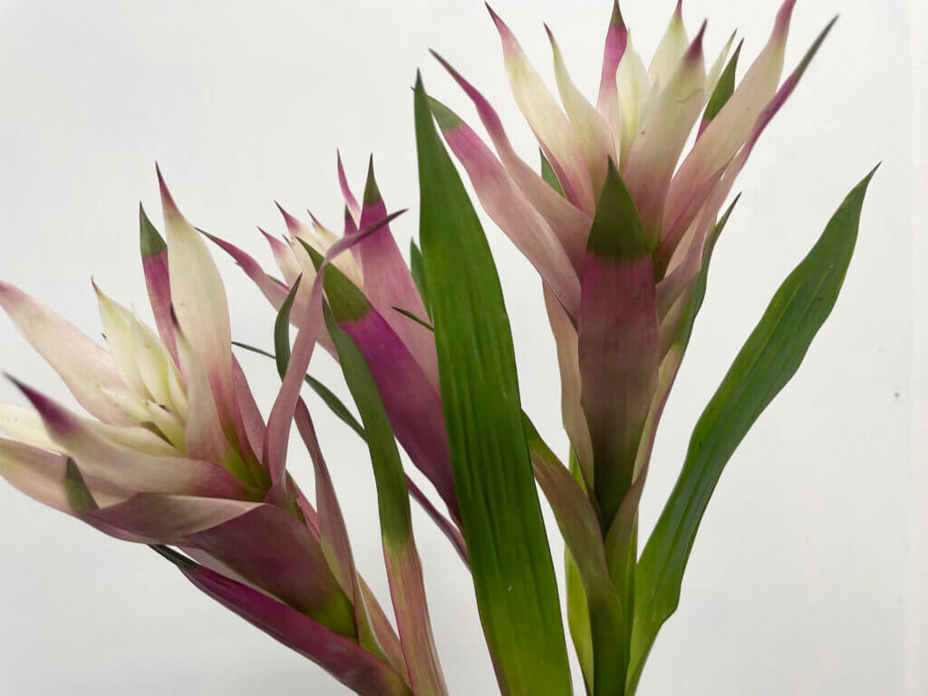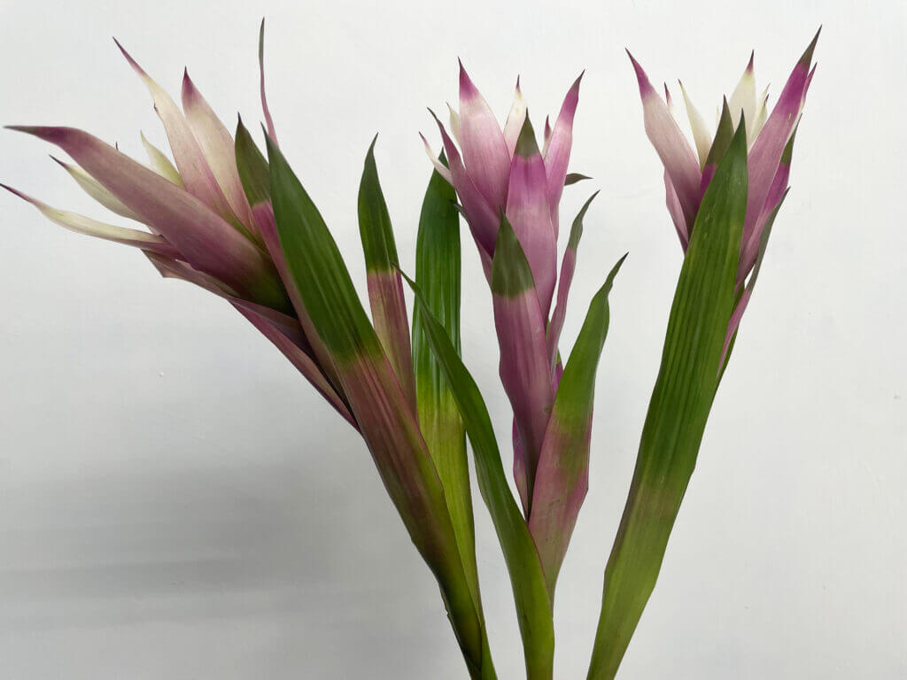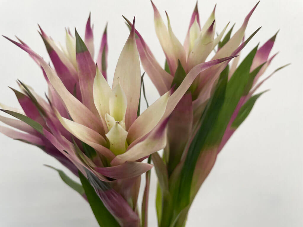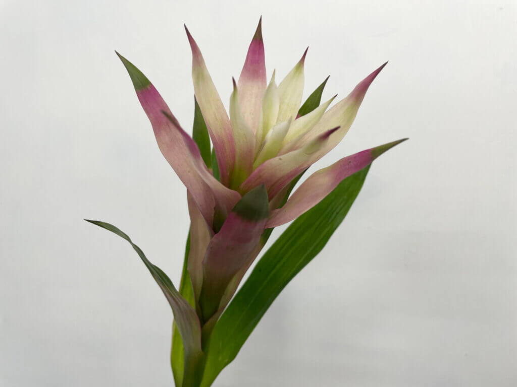 特徴:『サブリナ』は、やわらかいピンク〜サーモンピンク系のグラデーションが美しいグズマニアの園芸品種で、放射状に広がる苞(ほう)がエレガントな印象を与えます。実際の花は苞の中心から咲く小さな白〜黄花ですが、観賞の中心は華やかな苞です。全体の草丈は40〜60cm前後。やさしく上品な色味で、トロピカルフラワーの中でもフェミニンな印象を持つ希少品種です。