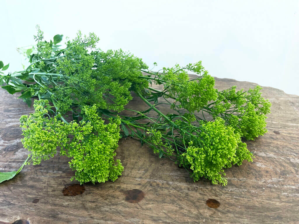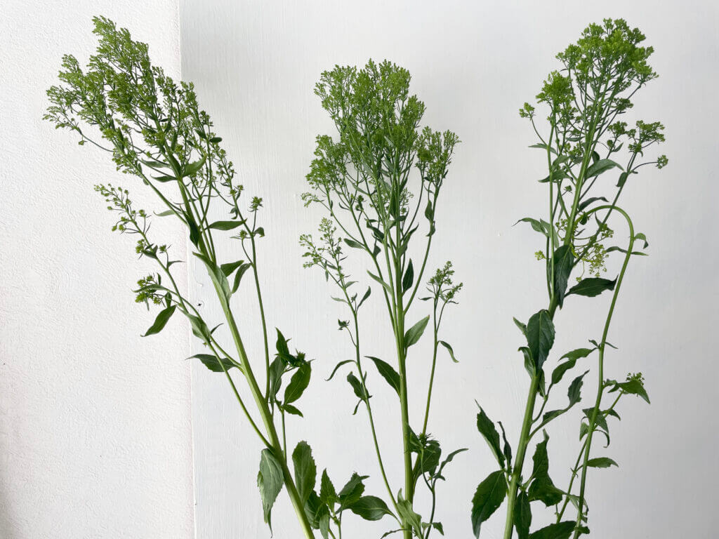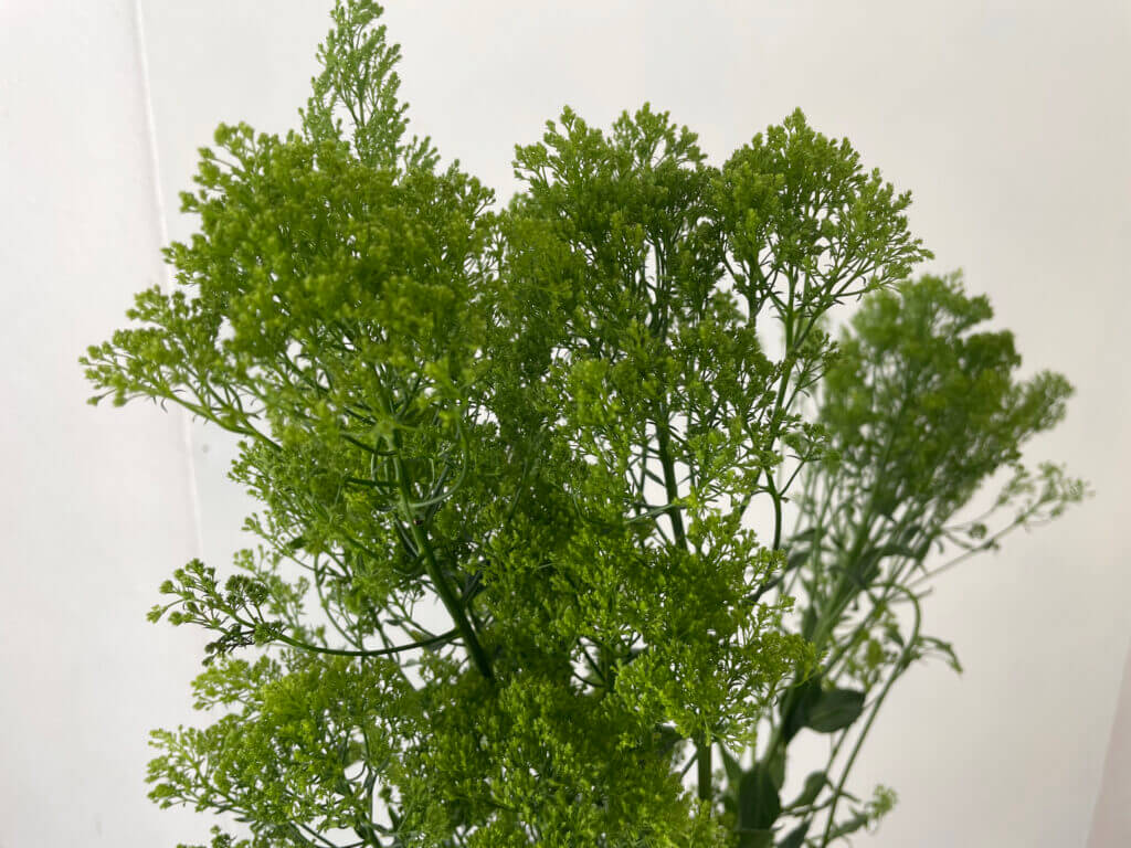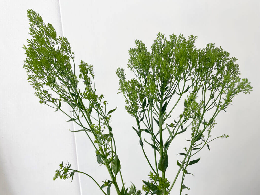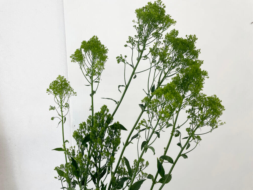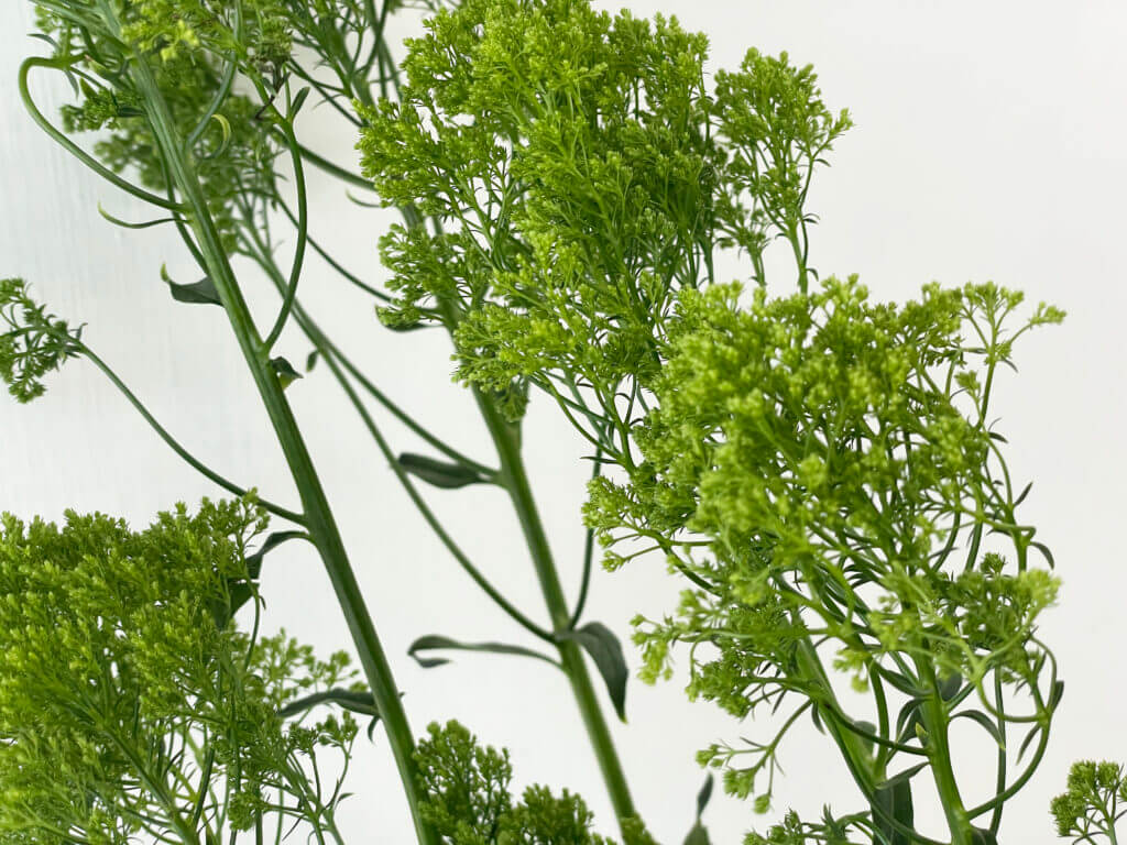 特徴:『ブリバグリーン』は、トラケリウム(夕霧草)の中でも、淡いグリーン〜ライム系の発色が美しい品種。細かい小花が密に集まって半球状に咲く姿は、空間にふんわりとしたニュアンスを与えます。草丈は約50〜70cm、花径は10cm前後。繊細な見た目に反して茎はしっかりしており、アレンジのボリューム出しやテクスチャーのアクセントとして人気があります。